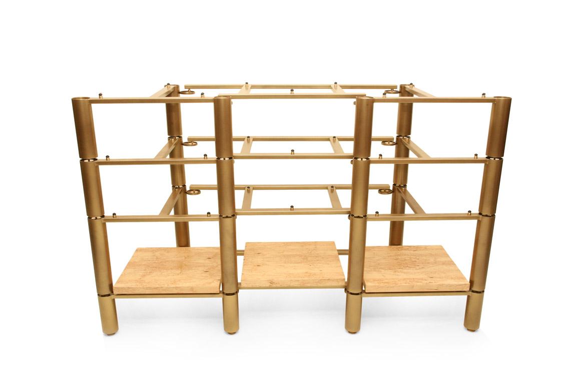 X-level modular stand (12-modular version presented here) with 40 and 50 mm thick shelves covered in natural wood veneer (birch burl) . The frame color is golden brass. The frame contains quartz sand ballast (bolted holes in the legs make it possible to change the amount and kind of ballast). The structure consists of two kinds of separate modules (A and B). The structure consists of individual modules, which can be placed vertically (one on top of another) or side by side. The modules are separated by means of height-adjustable spikes and anti-vibration pads. The original set may be expanded by adding extra modules.