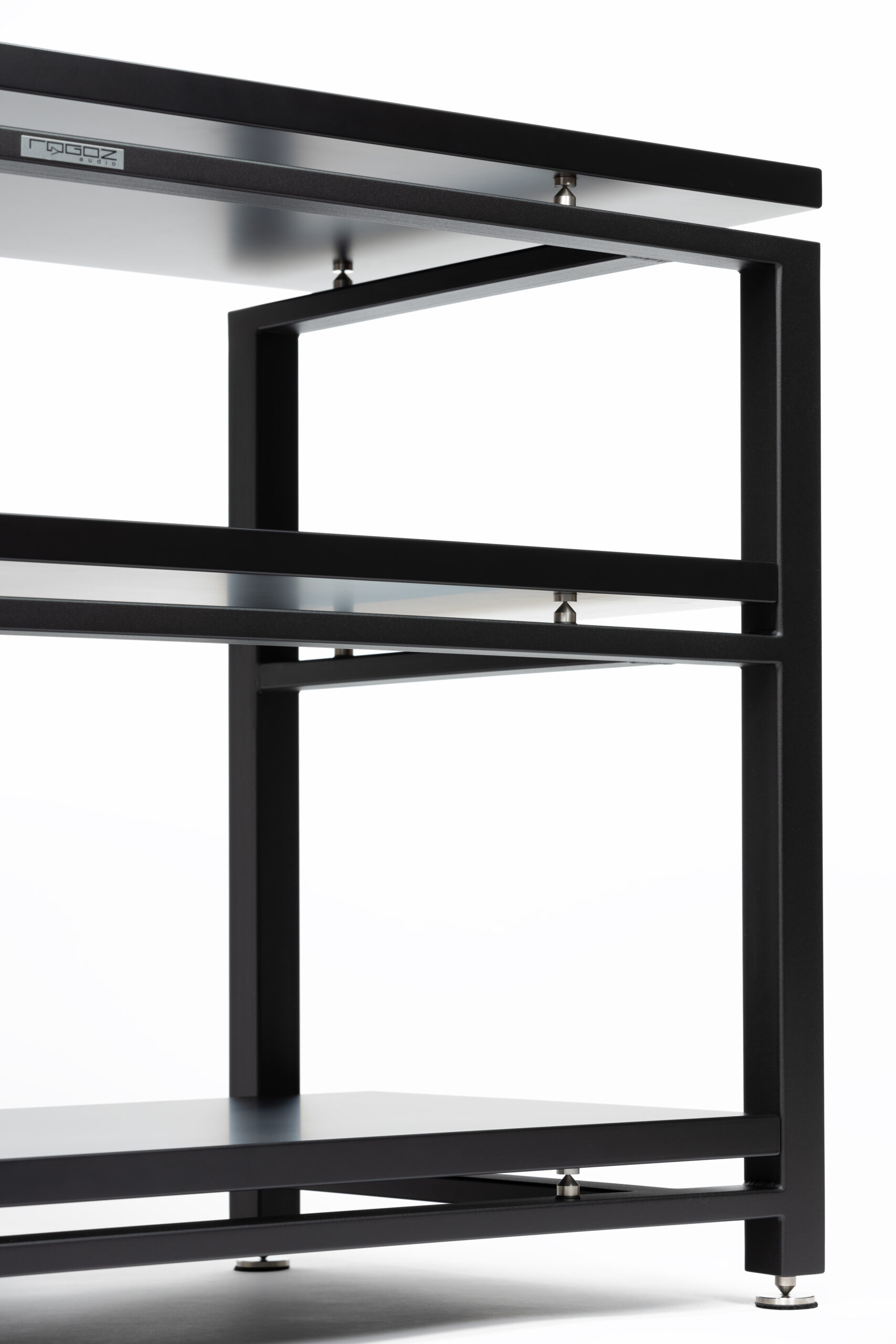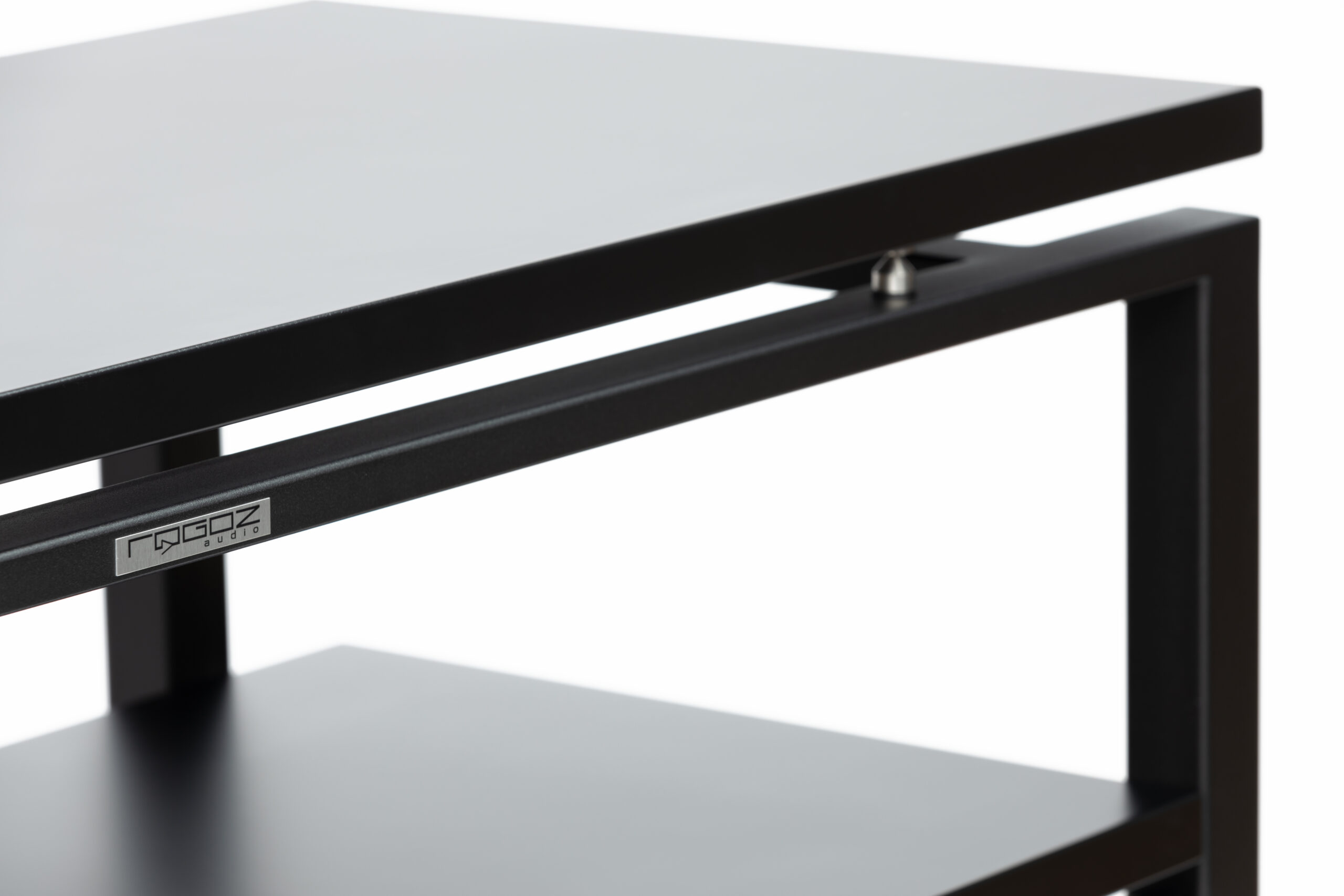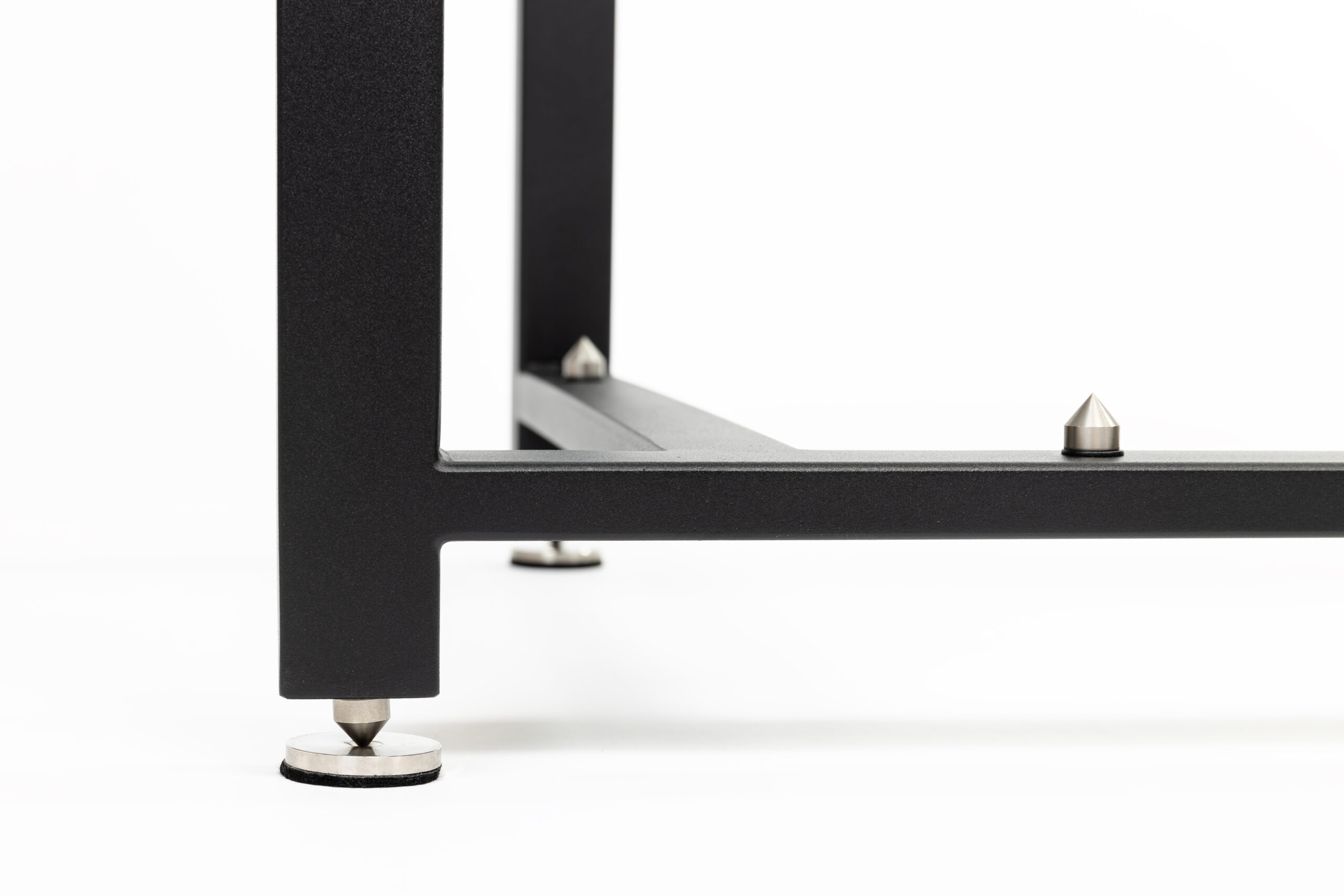 Stoliki antywibracyjne przeznaczone są pod komponenty audio wysokiej klasy. Konstrukcje zostały zestrojone przez odpowiednie połączenie stali stopowych i wysokowęglowych. Rama składa się z grubościennych nóg wykonanych ze stali węglowej S235JR (stosowanej do konstrukcji nośnych poddawanych dużym obciążeniom dynamicznym – np. w dźwigach) oraz łączących je poprzeczek ze stali stopowej o podwyższonej wytrzymałości S355. Precyzyjnie poziomowane odbywa się za pomocą regulowanych stożków antywibracyjnych.