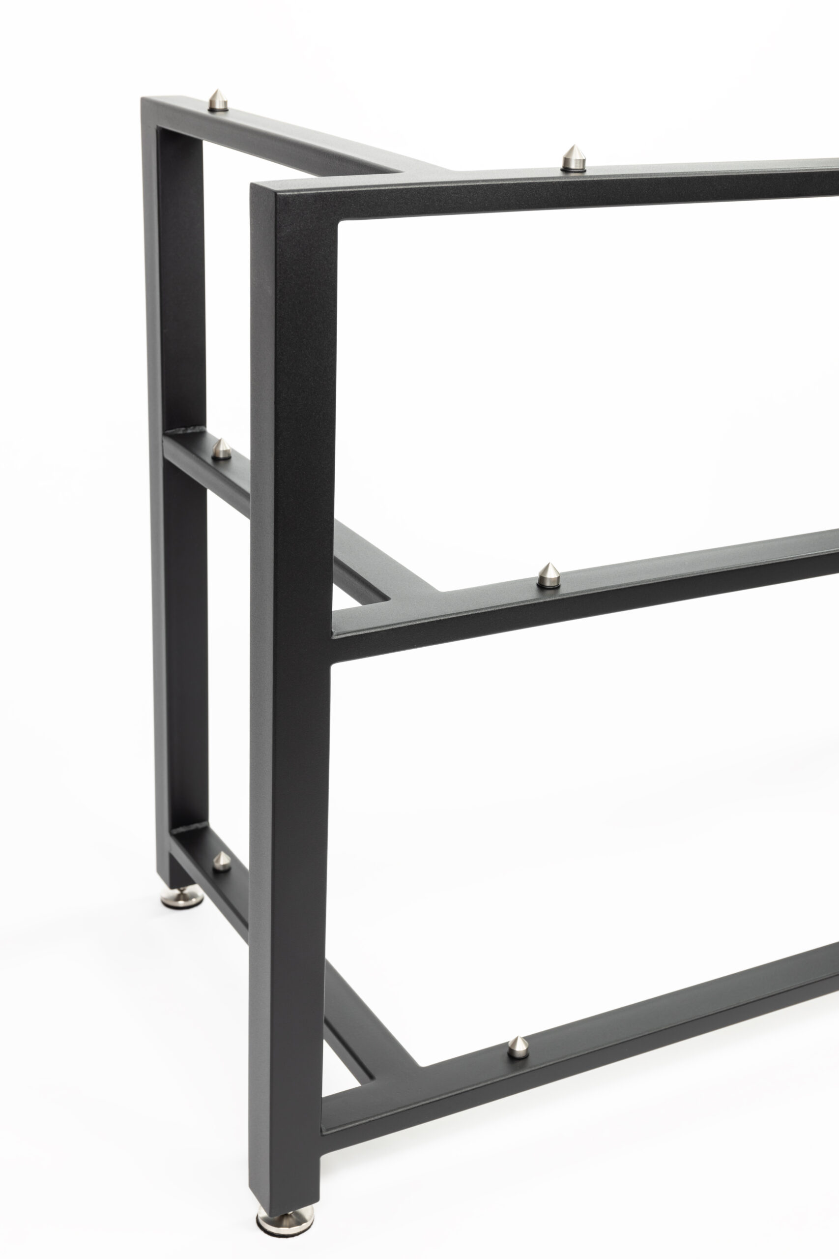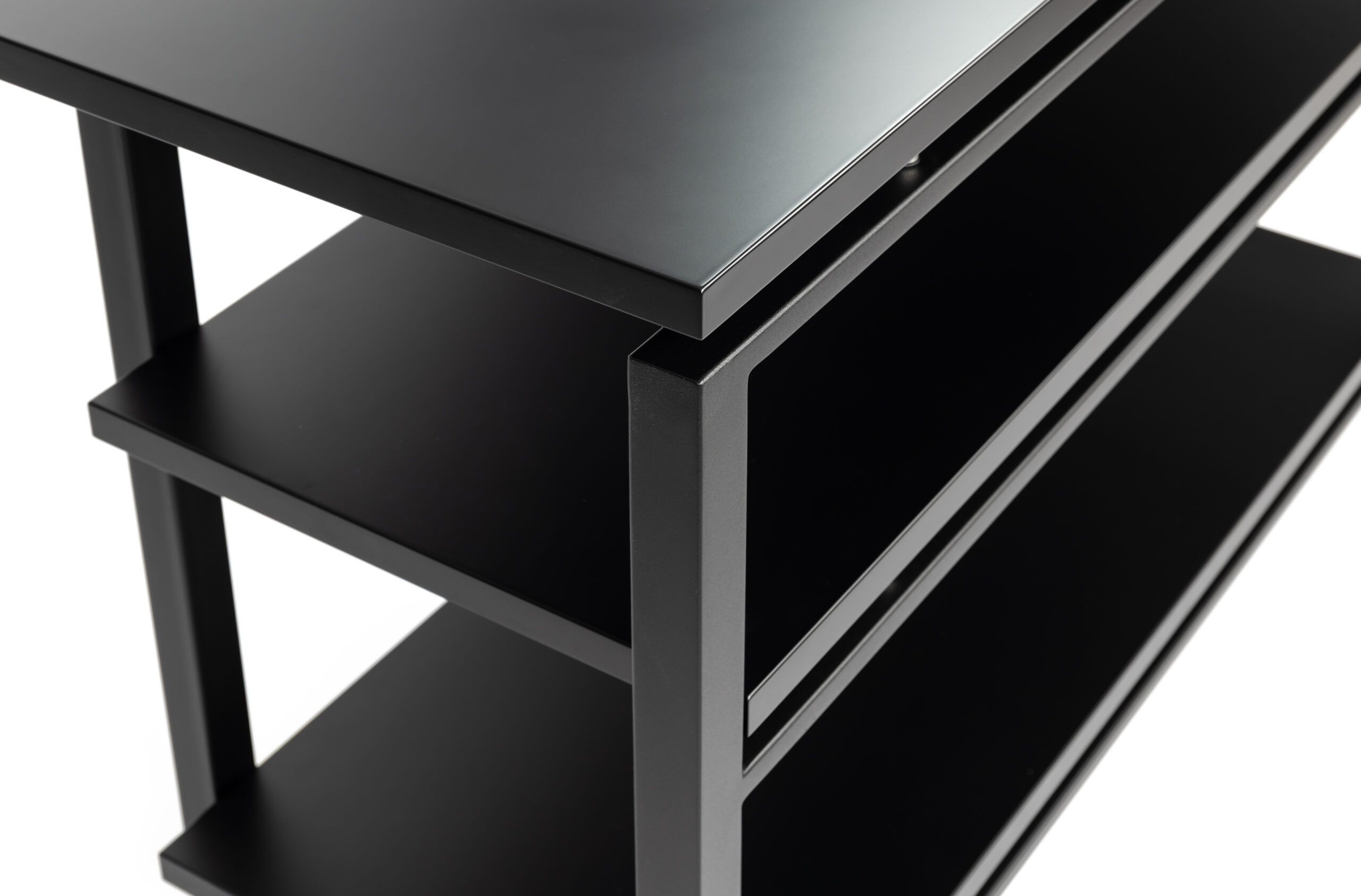 Stolik czteronożny, trójpoziomowy, z blatami grubości 30 mm lakierowanymi na kolor czarny (półmat). Stelaż balastowany jest piaskiem kwarcowym (zakręcane otwory umieszczone z tyłu nóg pozwalają na zmianę ilości oraz rodzaju balastu). Kolor stelaża – czarny (mat, drobna struktura).