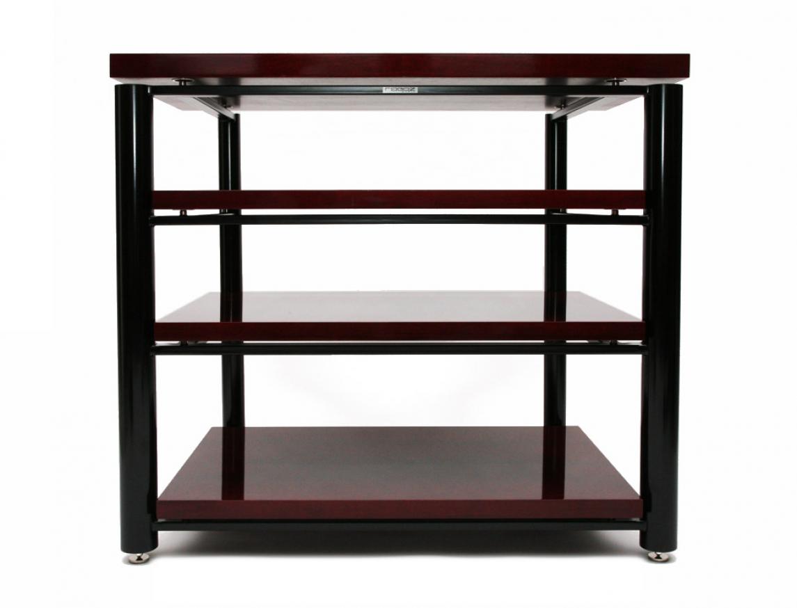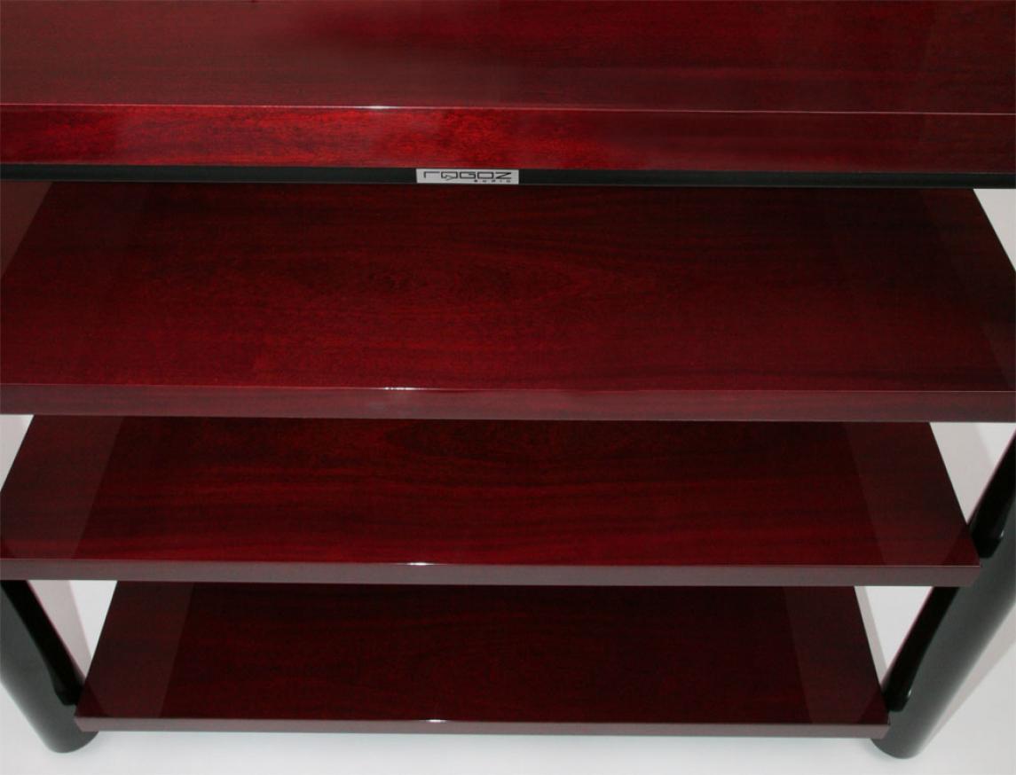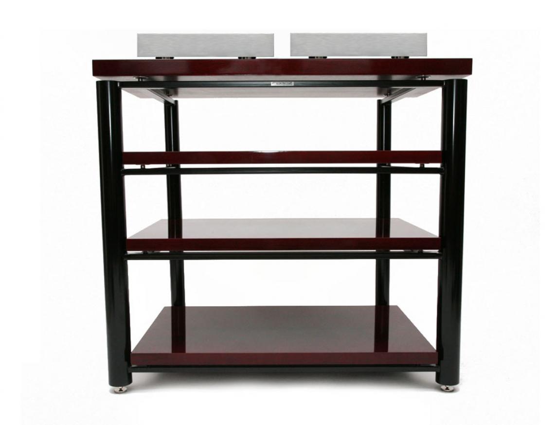 Stolik czteronożny, czteropoziomowy, z blatami pokrytymi naturalnym fornirem (mahoń sapeli, barwiony nr 25-25, połysk fortepianowy). Stelaż balastowany piaskiem kwarcowym (zakręcane otwory umieszczone z tyłu nóg pozwalają na zmianę ilości oraz rodzaju balastu). Kolor stelaża – czarny (pół-mat). Blat wierzchni o grubości 50 mm jest zoptymalizowany dla gramofonów analogowych oraz źródeł cyfrowych. Blaty dolne mają grubość 40 mm. Wszystkie blaty odseparowane są od stelaża stolika przez układ BBS. Układ BBS (Balancing Board System) posiada właściwości kinematyczne oraz dynamiczne umożliwiające ,,pływanie” izolowanych mas na boki w stosunku do osi systemu, przy jednoczesnym zachowaniu punktowego podparcia. Układ zapewnia także możliwość poziomowania blatów.