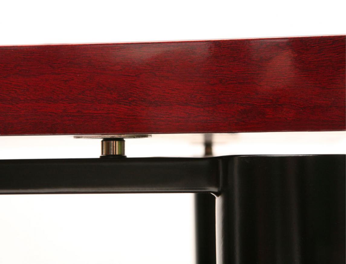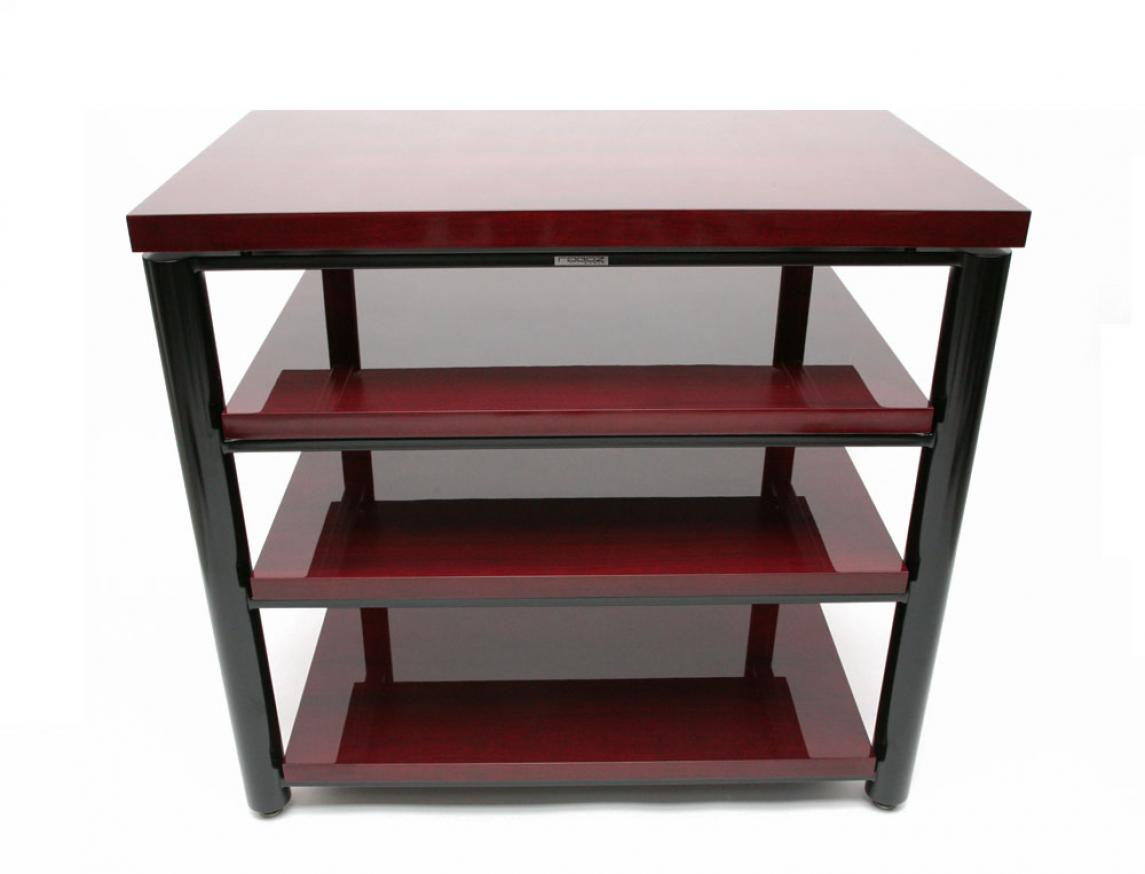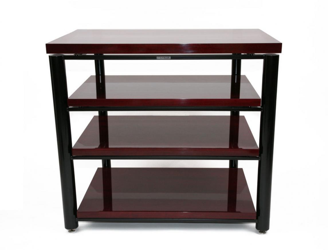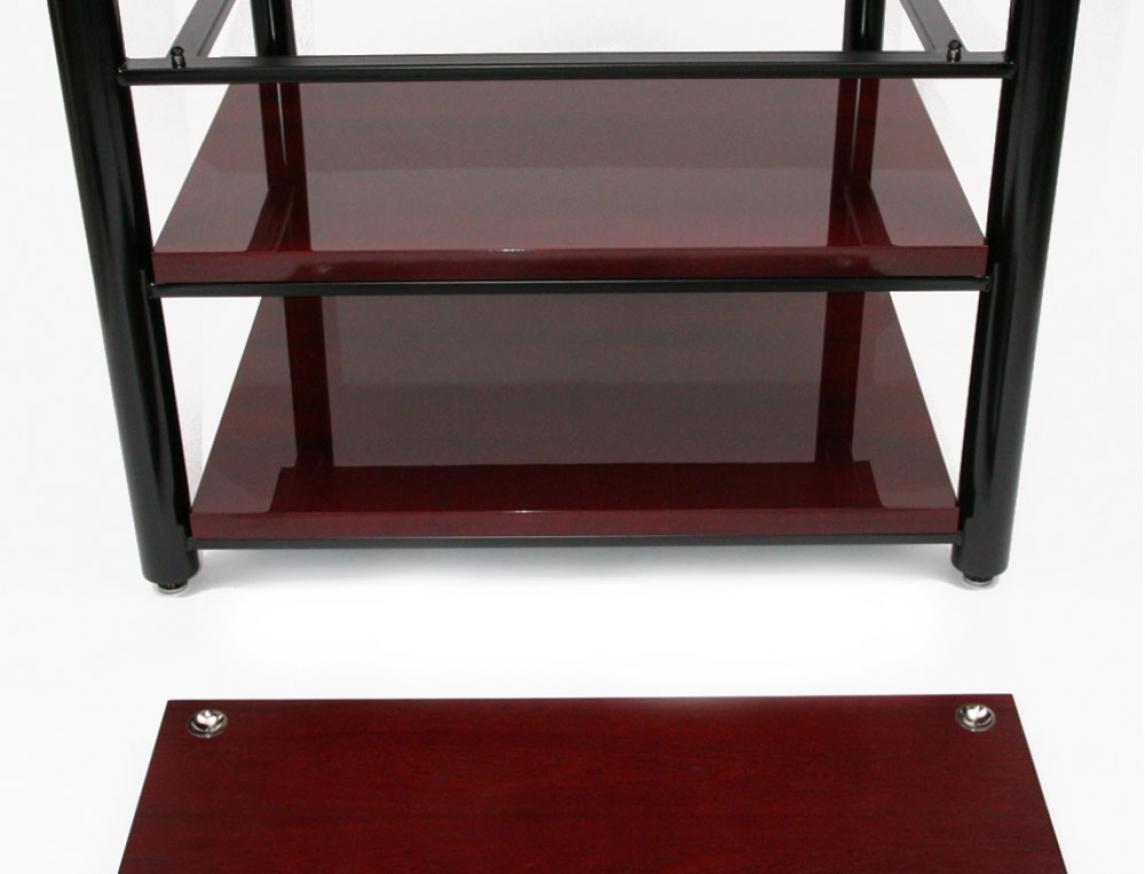 Stolik czteronożny, czteropoziomowy, z blatami pokrytymi naturalnym fornirem (mahoń sapeli, barwiony nr 25-25, połysk fortepianowy). Stelaż balastowany piaskiem kwarcowym (zakręcane otwory umieszczone z tyłu nóg pozwalają na zmianę ilości oraz rodzaju balastu). Kolor stelaża – czarny (pół-mat). Blat wierzchni o grubości 50 mm jest zoptymalizowany dla gramofonów analogowych oraz źródeł cyfrowych. Blaty dolne mają grubość 40 mm. Wszystkie blaty odseparowane są od stelaża stolika przez układ BBS. Układ BBS (Balancing Board System) posiada właściwości kinematyczne oraz dynamiczne umożliwiające ,,pływanie” izolowanych mas na boki w stosunku do osi systemu, przy jednoczesnym zachowaniu punktowego podparcia. Układ zapewnia także możliwość poziomowania blatów.